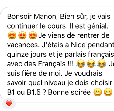 Avoir un natif français bienveillant à tes côtés te permet de recevoir des retours personnalisés et de t’améliorer à l’oral comme à l’écrit.