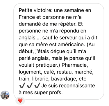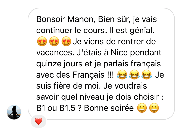 En plus de pouvoir pratiquer régulièrement ton français avec d’autres super-élèves, tu peux rejoindre notre groupe WhatsApp privé.